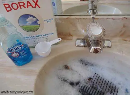 Everyone should clean their brushes and combs once in a while. To clean them and break down any oils, soak your brushes and combs in a mixture of warm water, liquid dish soap, and Borax.