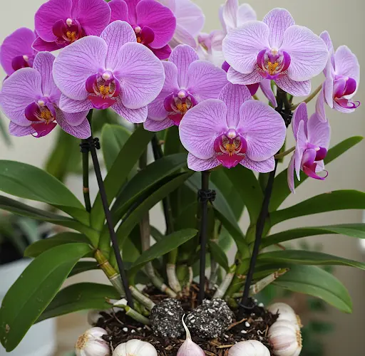 - Garlic helps prevent root rot and fungal infections that can damage orchids.