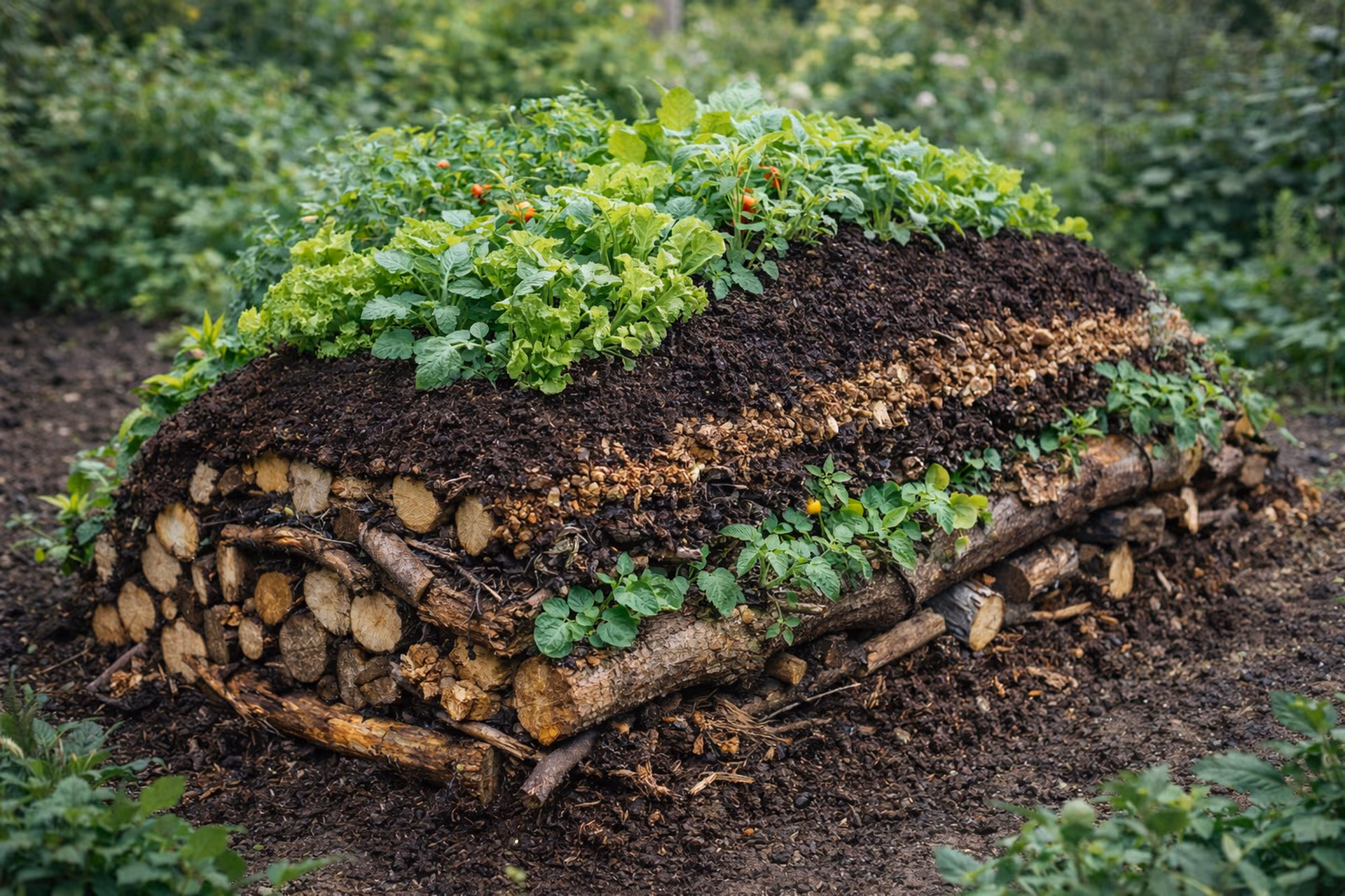 Hugelkultur beds function like a slow compost pile underground, continuously feeding plants with nutrients.