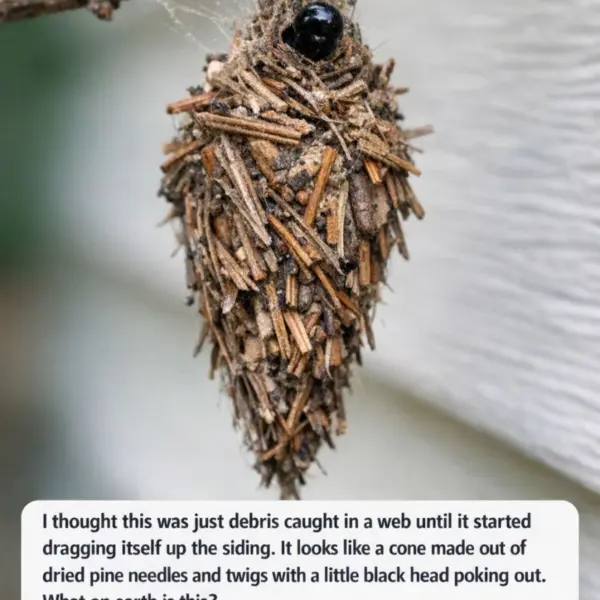 As you walked along the side of your house, you noticed something peculiar hanging from the siding. At first glance, it seemed like nothing more than debris caught in a spider web. However, upon closer inspection, you realized this was something entirely different. The small structure, resembling a cone made from dried pine needles and twigs, began to move, revealing a tiny black head peeking out from its tip.