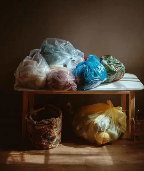 Collect and sort the plastic bags by color. Flatten each bag to remove any creases.