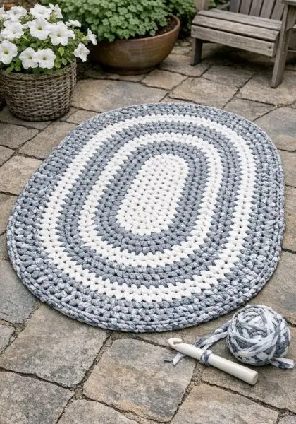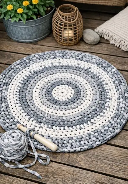 This DIY outdoor rug can add texture and interest to your patio or balcony. Pair it with neutral tones and natural materials like wood or rattan furniture for a cohesive look. The grey and white color scheme of the rug complements a variety of color palettes, making it a versatile piece that fits into both modern and rustic outdoor settings.