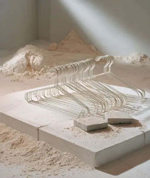 Wearing protective gloves and a dust mask, carefully pour the cement mixture over the stacked hangers, ensuring it fills all gaps and covers the entire structure.