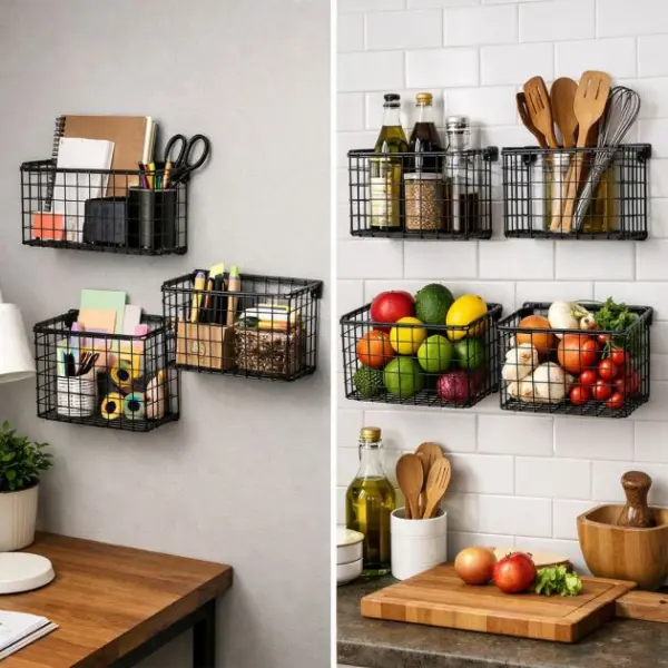 These wall-mounted baskets can be used to store anything from books to kitchen utensils. In a home office, they provide easy access to supplies such as notebooks and pens, keeping your workspace organized and clutter-free. In the kitchen, they can hold fruits and vegetables, freeing up valuable counter space.