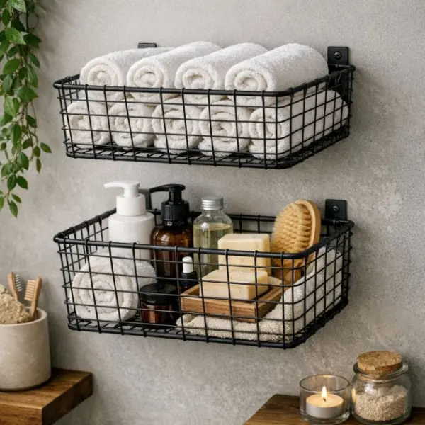 Wire baskets can serve as a chic and practical solution for bathroom storage. Choose baskets that are around 12×8 inches to hold towels and toiletries. Place them on open shelves or mount them on the wall to maximize space.