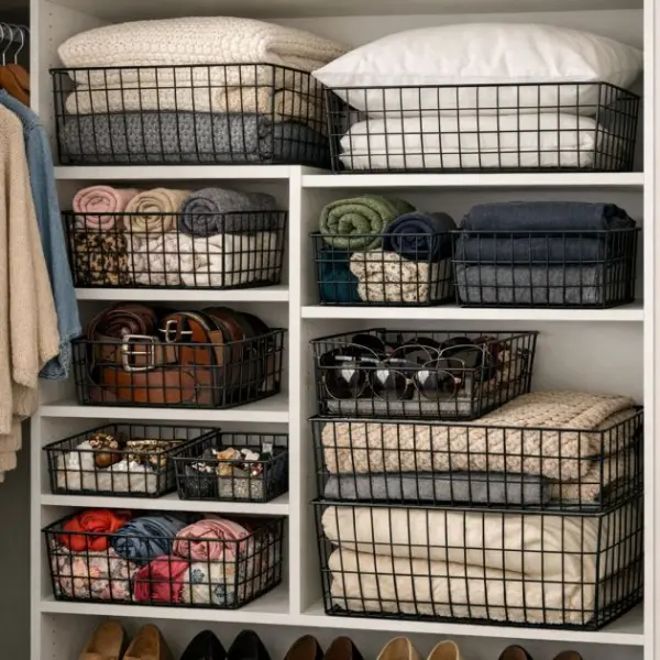 Maximize closet space by using wire baskets to store accessories and linens. Opt for baskets that are 12×12 inches or larger to accommodate items like scarves, belts, and folded linens. Stackable baskets can be placed on shelves to optimize vertical space.